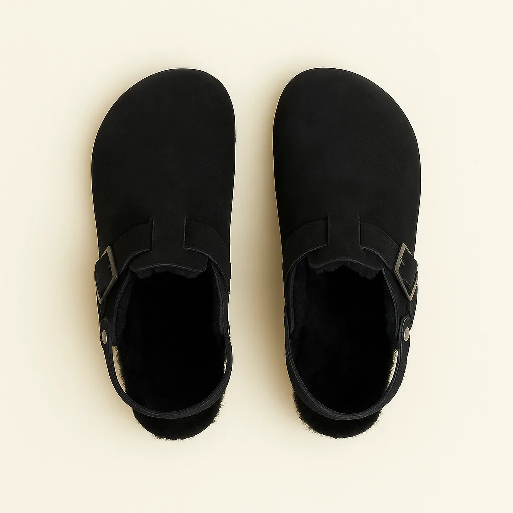 Conçue pour les moments cocooning, cette mule sabot pour femme enveloppe le pied d’une finition veloutée noire et d’une doublure fourrée au contact moelleux