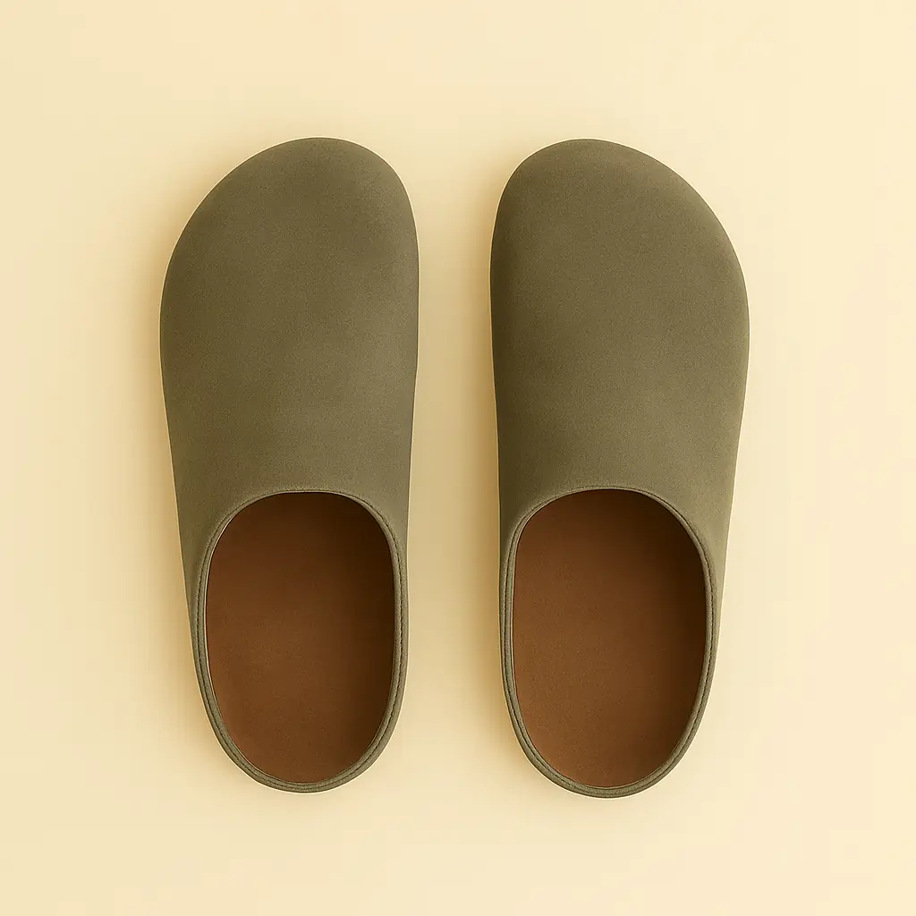 Couleur taupe olive, toucher velouté et silhouette épurée. Cette mule sabot s’enfile d’un seul geste et accompagne les moments calmes de la maison.